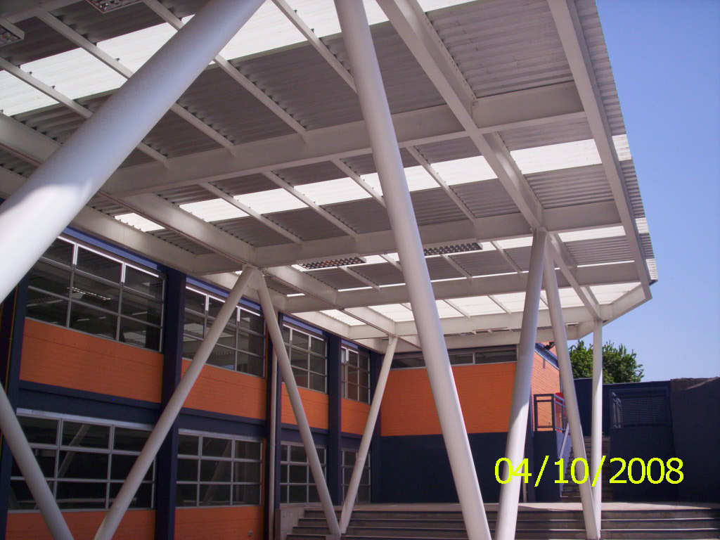 Escuela de dos pabellones, en Acero Estructural y Losa Colaborante. Patios Cubiertos en estructuras de Acero.