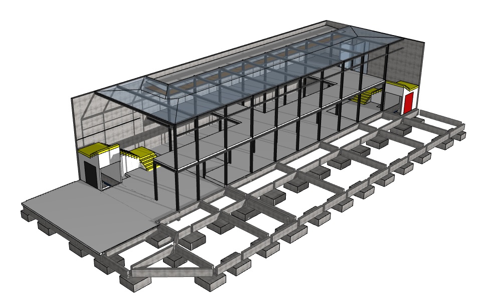 Estructura de hormigón armado de dos niveles y patio central con cubierta de acero.