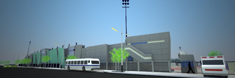 Estadio con Gradas de Hormigón y Salas Multiusos de dos niveles.